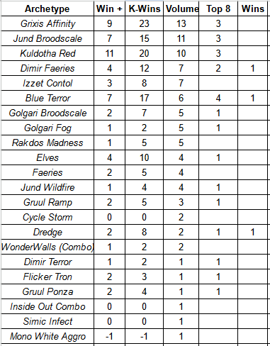 The three best decks on the weekend, going by Adjusted Meta Score Above Replacement, where Blue Terror (0.91), Kuldotha Red (0.89), and Grixis Affinity (0.83). While these three decks being at the top of the metagame is not a surprise, the lack of spread is something of note. All three of these decks are within 1/10th of a win from each other and all three performed less than one win above the average Top 32 deck. Compare this to last week where the top three decks were Golgari Fog (3.34), Grixis Affinity (3.2), and Golgari Broodscale (2.39). The dip from third to fourth place last week was 0.87; this week that spread was 0.52 (technically the fourth best deck was Dredge with an aMSAR of 0.37 – a delta of 0.46 – but Dredge had two total appearances to Jund Broodscale’s eleven Top 32 finishes).
