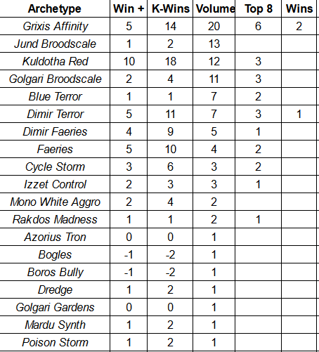 The three Challenges that took place from November 29 to December 1 were small, even by recent standards. In two of the events, players with 1-5 records made the Top 32. This is not giving me pause as late November into December usually heralds a dip in participation thanks to the American Thanksgiving holiday leading right into the Winter Holiday season. The smaller field helped to highlight the concentration at the top of the metagame, with four macro-archetypes (Grixis Affinity, Kuldotha Red, and Golgari/Jund Broodscale) combined to hold more than 58% of the Top 32 metagame and 50% of all Top 8 slots awarded (although Jund Broodscale did not contribute to this latter achievement). Kuldotha Red ended up having the best weekend, ending Sunday with a 19.16% of the Winner’s Metagame (compared to 12.5% of the overall Top 32) and an Adjusted Meta Score Above Replacement of 0.89. While Affinity had the second most impressive Winner’s Meta Share (16.4%), this represented about a 4% decline from it’s Top 32 share.