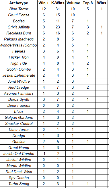Blue Terror and Grixis Affinity were smart choices for an open field when two of the expected emergent decks were spell based combo and long game control. Both have access to disruption and the ability to apply pressure. Terror has better stack interaction while Affinity can do more to grind out games against Tron thanks to Makeshift Munitions. One reason I am unsure about these strategies’ positions moving forward is due in part to the uncertainty around High Tide and Tron.