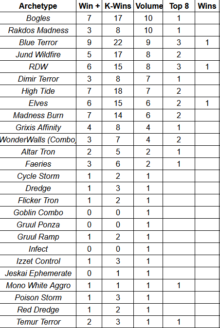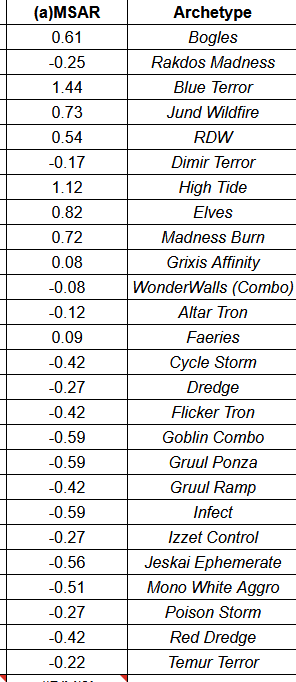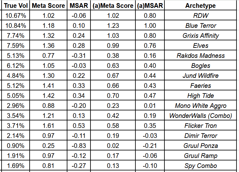The columns I would like you to focus on are True Volume and aMSAR. The former essentially weights a deck’s performance and adjusts it’s presence depending on how well an archetype performs. Blue Terror might only account for 10.55% of the overall metagame but it slightly improves upon that number here at 10.84%. The True Volume/Winner’s Metagame gives a solid impression of what you can expect to see at the top tables. And the story is fairly consistent: Blue Terror is leading the way followed by old stalwarts Grixis Affinity and RDW with Elves hot on their heels.
