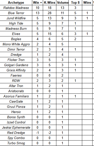It should be noted that after several weeks of larger challenges, these events were six round affairs. Saturday’s challenge had a relatively meager 42 players which is a a decent amount less than the 60 something we had seen for much of last season. That fact does not have any impact on the numbers presented above as these are merely cumulative; the size of a tournament will not impact the Top 8s acquired over the course of the season. What the number of players can influence, however, is how much cream rises to the top.