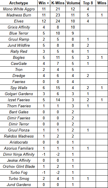 As mentioned last week, Leonardo, Big Brother, has given Mono White a shot in the arm. The deck is already well equipped to make use of enters-the-battlefield effects thanks to Kor Skyfisher and the latest addition provides that effect while also piling on the damage. The new card gives Mono White another damage engine outside of force multipliers like Guardians’ Pledge. As seen with Madness Burn providing established assertive strategies additional sources of damage pushes them up the metagame ladder. While it was the most popular strategy, Mono White lagged behind both Elves and Madness burn in Adjusted Meta Score Above replacement (0.91 to 1.44 and 1.18 respectively) and in Winner’s Meta Share (11.36% compared to 11.8% and 11.49%), but that doesn’t detract from its meteoric rise from “fringe contender” to “top strategy”.